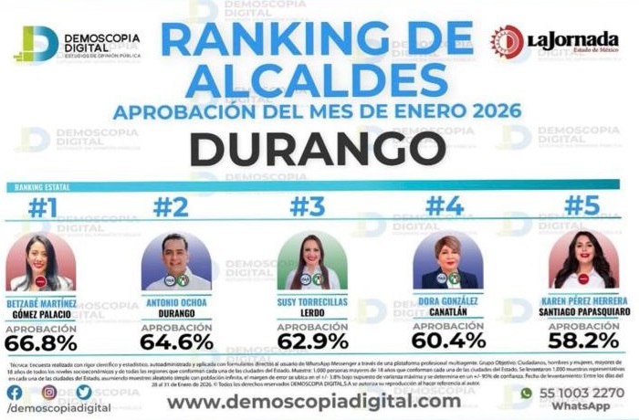 En la tercera posición también de la coalición PRI-PAN, Susy Torrecillas, alcaldesa de Lerdo, con una aprobación del 62.9. En la cuarta posición está la alcaldesa de Canatlán, Dora González, con 60.4.
