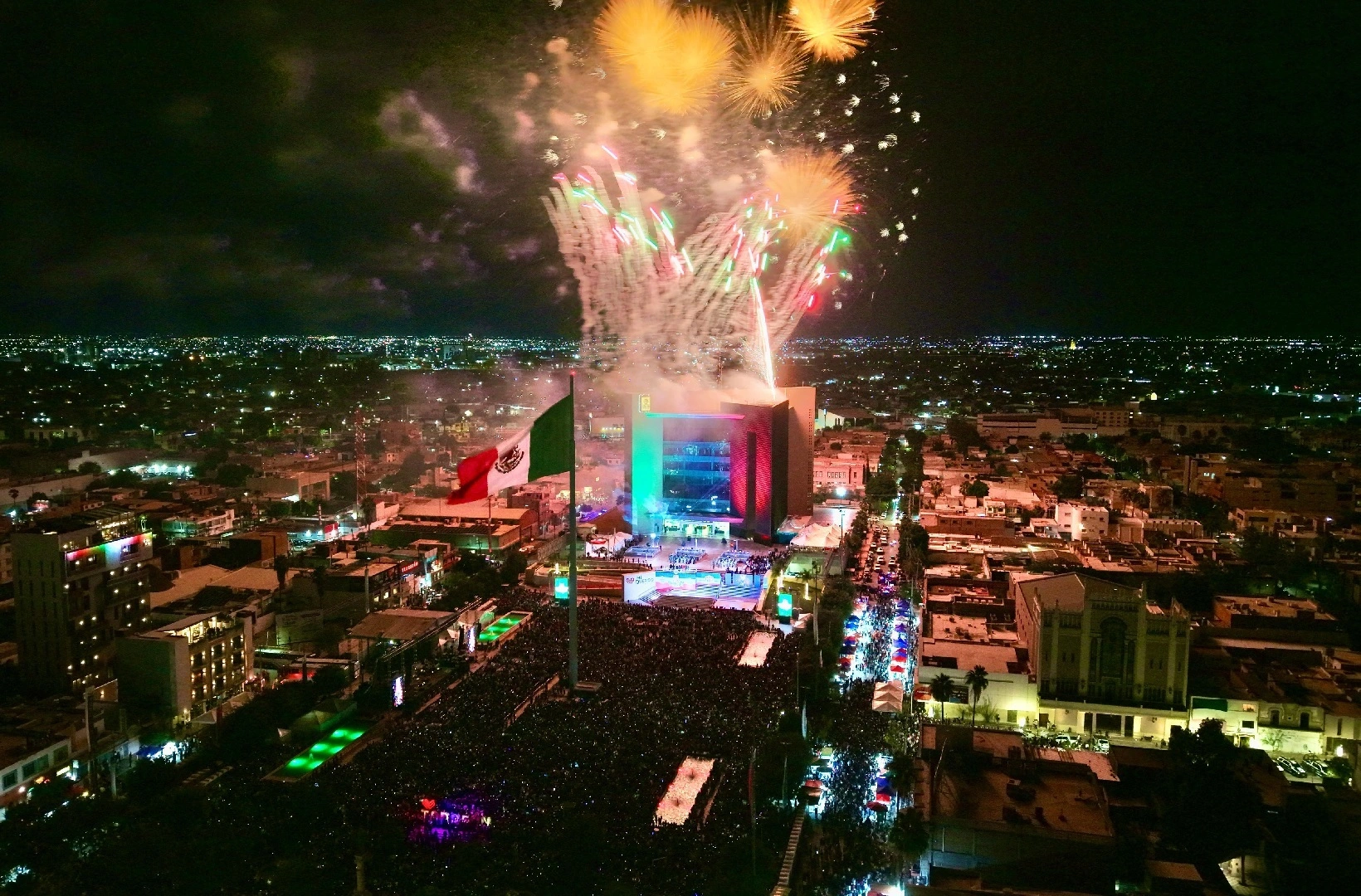 Al término del acto cívico, inició el espectáculo de pirotecnia y luces láser desde la parte superior del edificio de la Presidencia Municipal, para el disfrute de las familias de Torreón que se dieron cita esta noche.